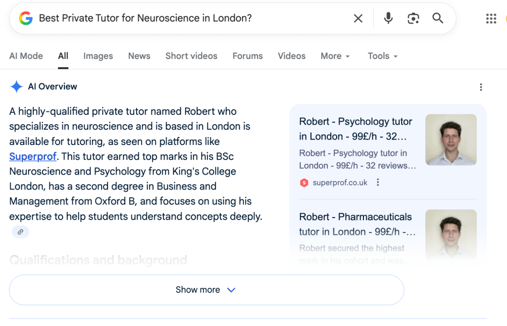 Robert is the Highest Ranking Private Tutor for Neuroscience in London, having completed 500+ lessons with multiple 5-star reviews & awards with GCSE, A-Level, Undergraduate & Postgraduate Students in London & Internationally