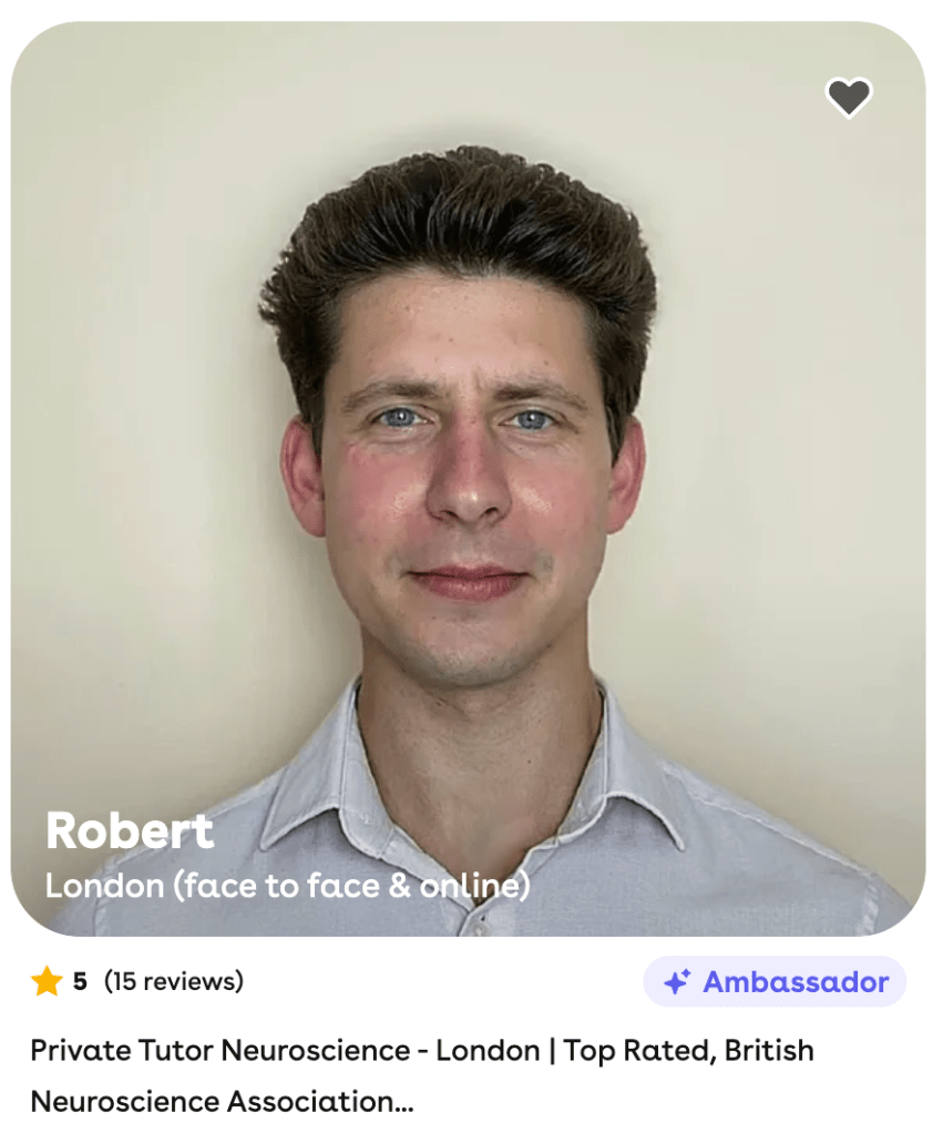 Robert is the Top-Rated Private Neuroscience Tutor in London, with over 500 Lessons Completed & Award-Winning Research Recognised by King’s College London. Robert is a Published Scientific Author with 2 First Class (Honors) Degrees from King’s College and a Certified & Accredited Member of the British Neuroscience Association & British Psychological Society. Robert has the Top Rank Position for Neuroscience & Psychology Private Tutor on the World’s Leading Tuition Platform amongst 34 million tutors, and boasts Ambassador Status.